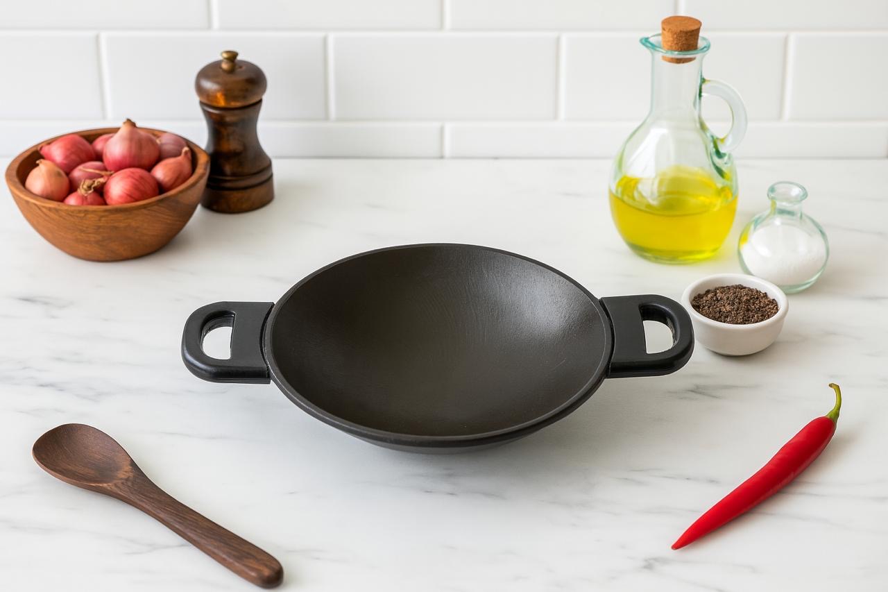CAST IRON APPAKAL WITH HANDLE(SEASONED): Bring home the authentic taste of Kerala with this handcrafted Cast Iron Appakal, designed for making appams — the soft, spongy rice pancakes with lacy, crispy edges. This seasoned appam pan comes with a welded side handle, offering both ease and safety during cooking.