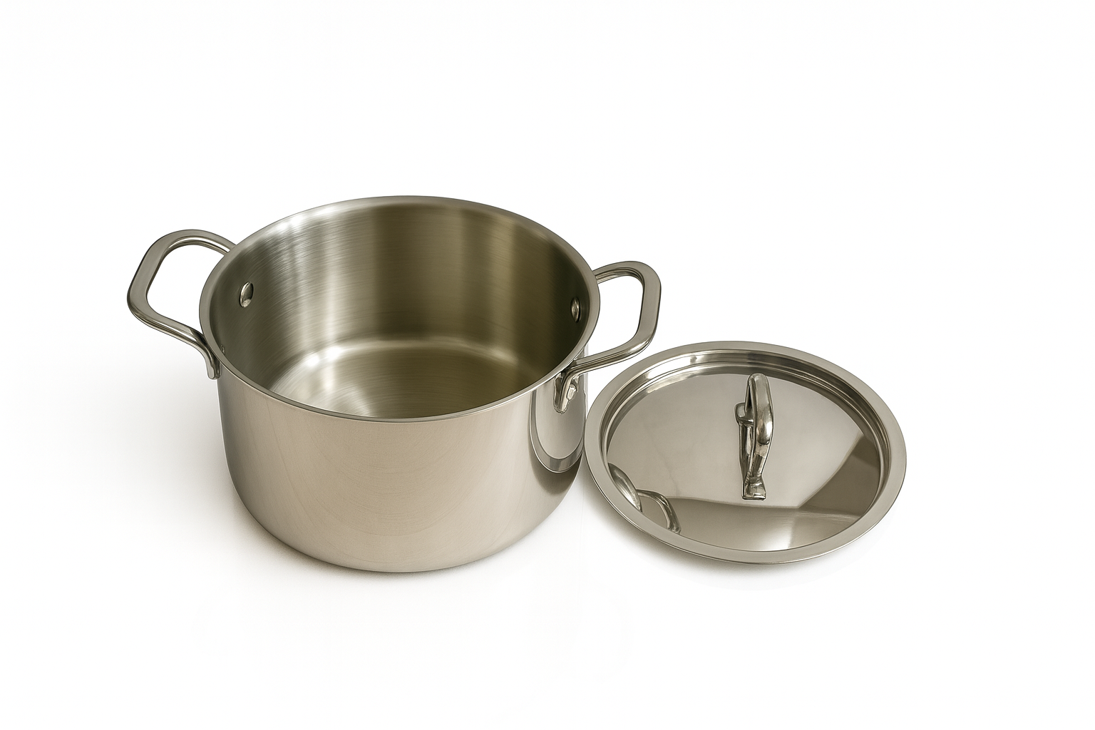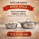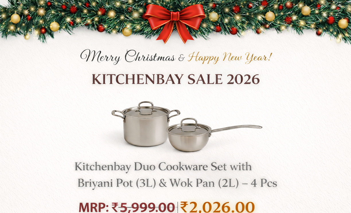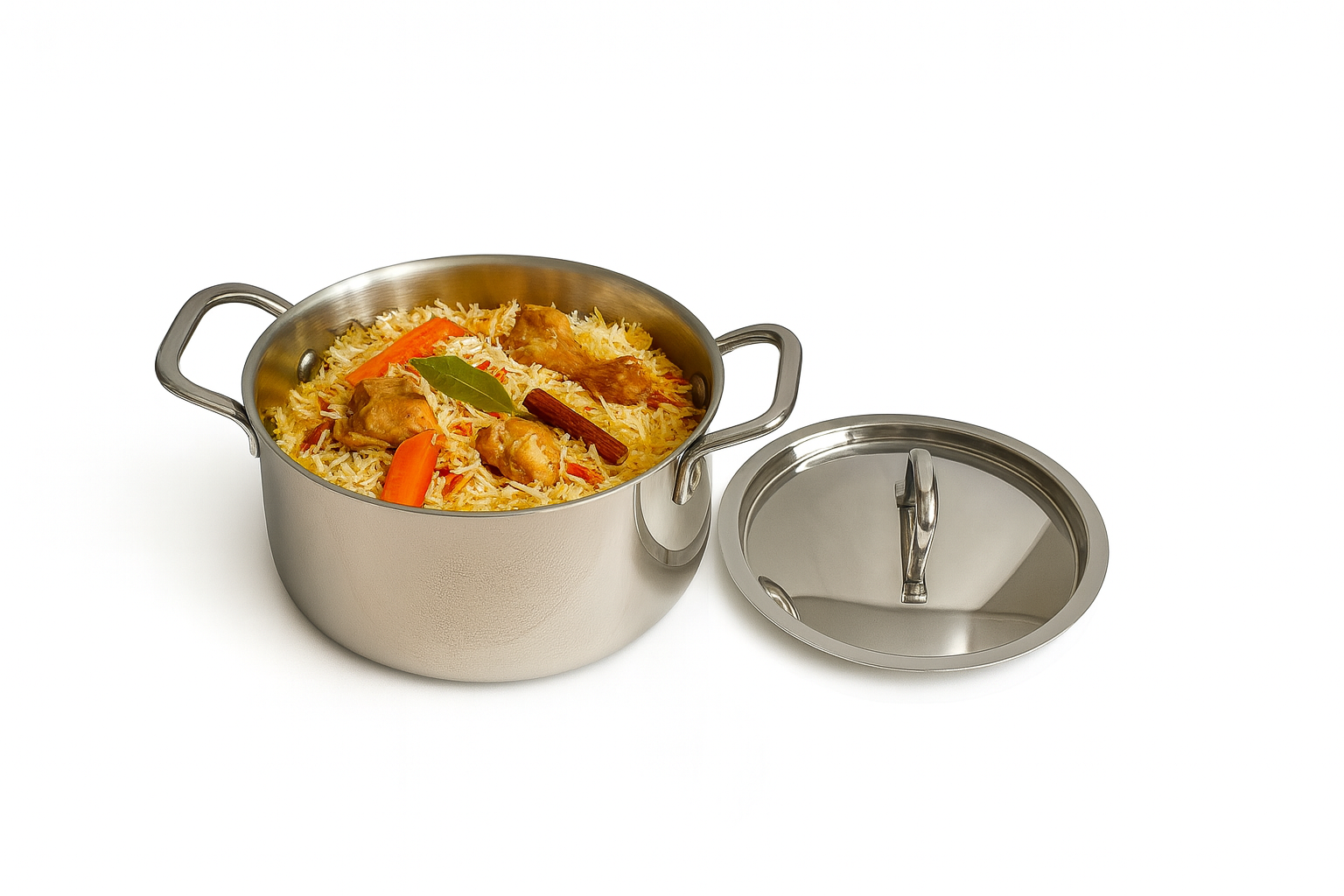 Kitchenbay Duo Cookware Set with Briyani Pot (3L) & Wok Pan (2L) – 4 Pcs: These pots usually have three layers—inner stainless steel (often 18/10), an aluminum or copper core for even heat distribution, and outer stainless steel (often 18/0)—that help ensure fast, uniform cooking and energy efficiency.