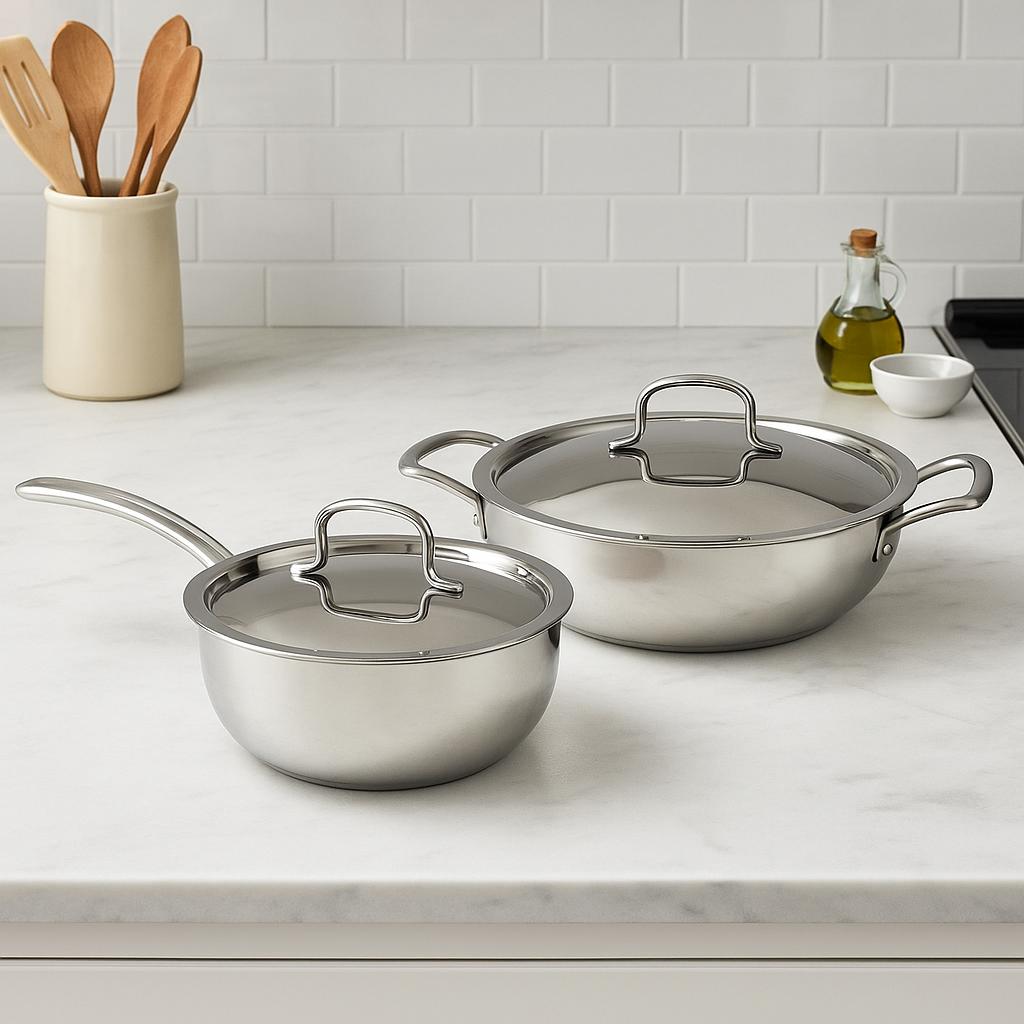 Durability: Riveted or cast handles (often cool-touch), thick bases (e.g., ~2.5 mm), and dishwasher compatibility in many sets.