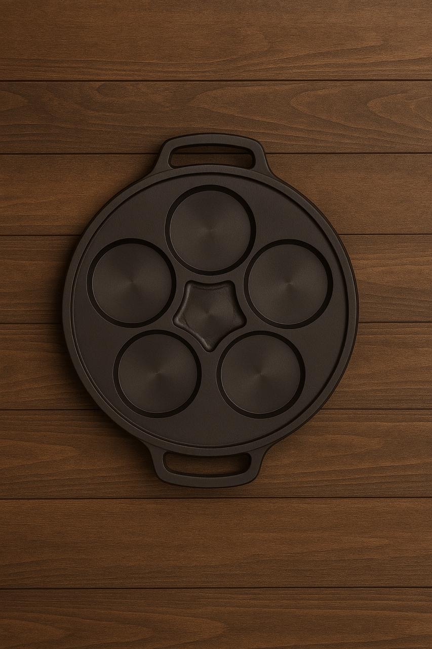 CAST IRON MINI UTTAPAM PAN(SEASONED)5PITS – Flavour-packed minis, the traditional way: Add an old-world twist to your modern kitchen with this Cast Iron Mini Uttapam Pan – 5 Pits, pre-seasoned and ready for action. Whether you’re making crispy mini uttapams, veggie-topped dosas, or tiffin snacks for the kids, this pan delivers perfectly round, evenly cooked delights every time — with the unmatched taste only cast iron can bring.