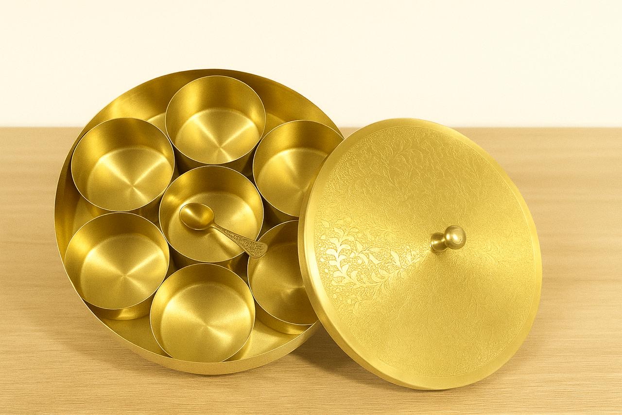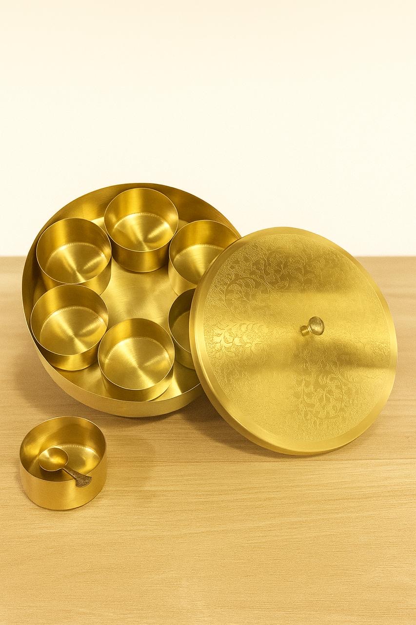 PURE BRASS MASALA BOX/SPICE CONTAINER: Rediscover the charm of traditional Indian kitchens with our Pure Brass Masala Box — a beautifully handcrafted spice container that blends heritage with functionality. Made from 100% pure brass, this timeless piece not only preserves the rich aroma and potency of your spices but also adds a touch of vintage elegance to your kitchen.