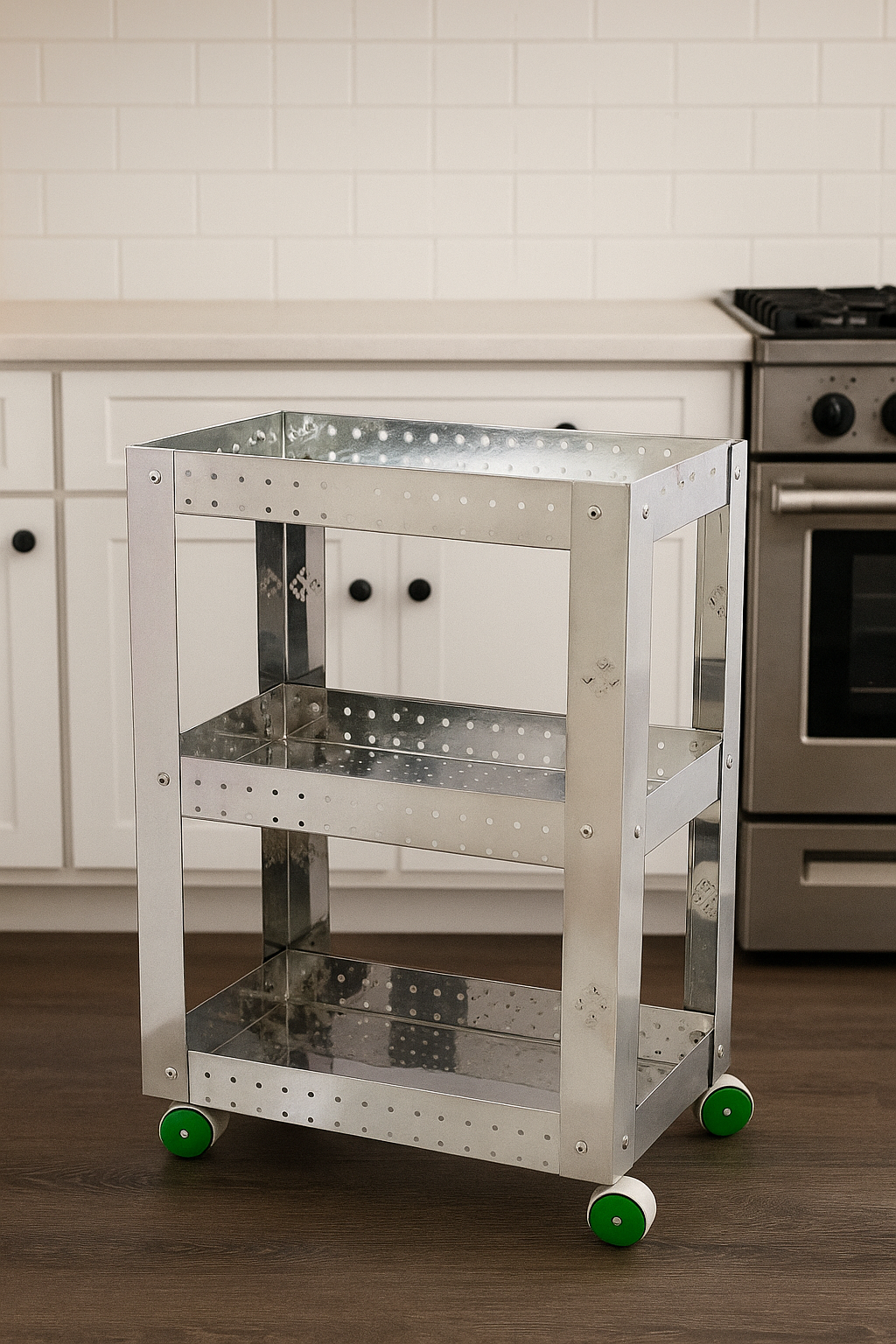 The three spacious tiers provide ample storage, while the open design ensures easy access and visibility. Its compact and mobile design makes it suitable for small or large kitchens, and the sturdy wheels offer smooth movement across surfaces.