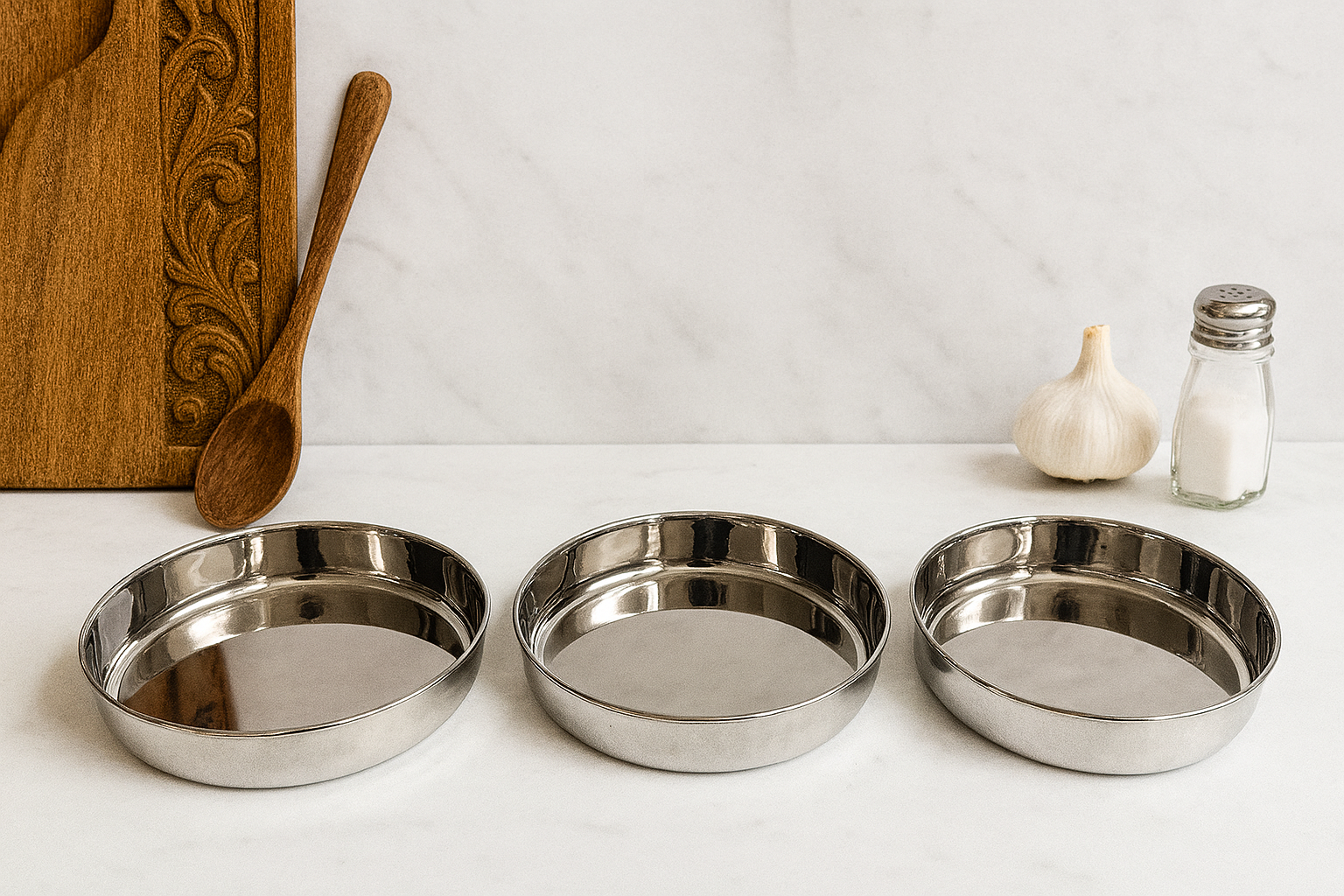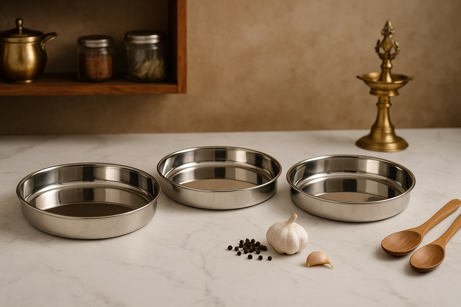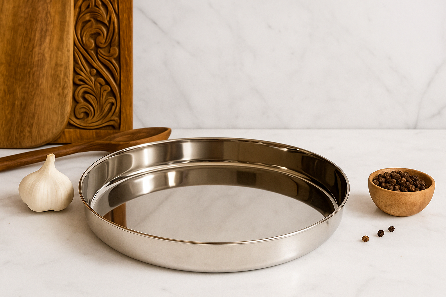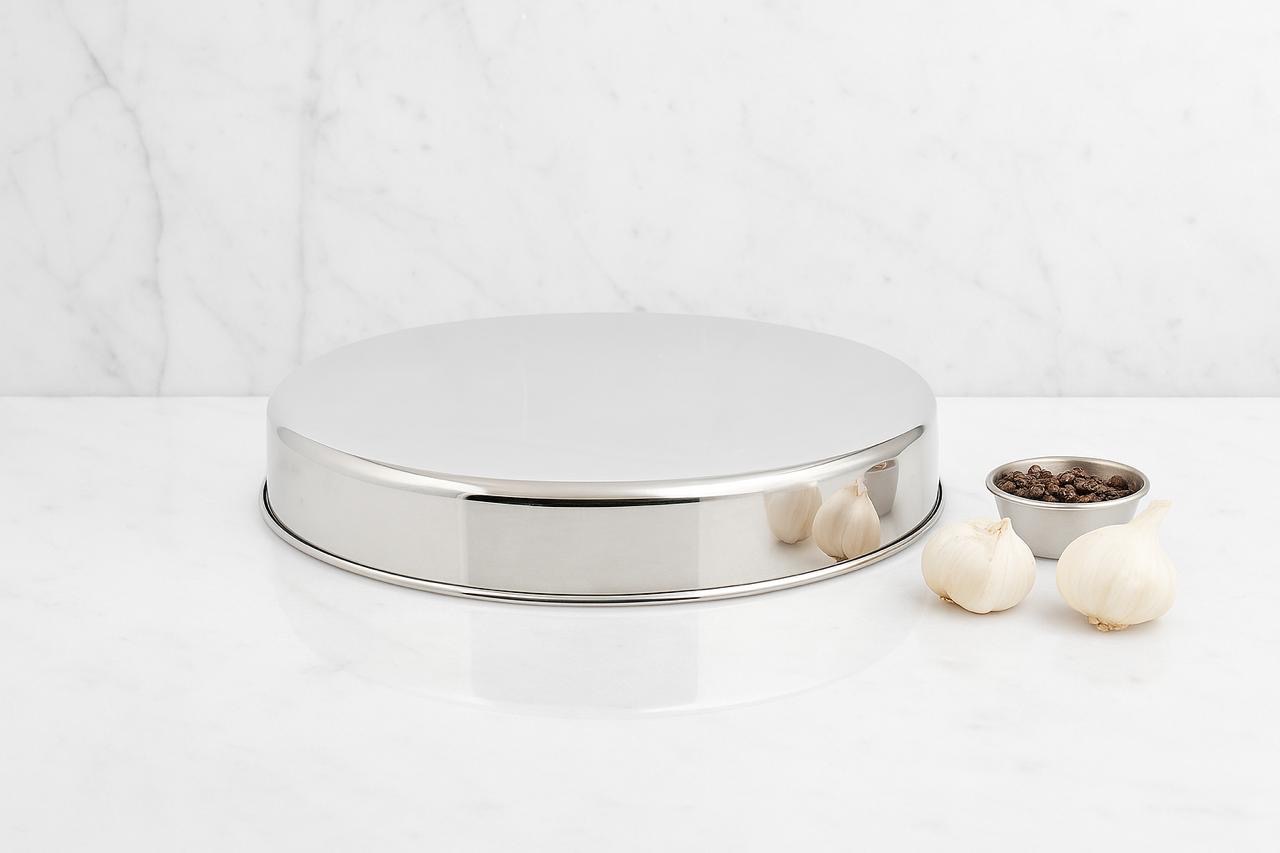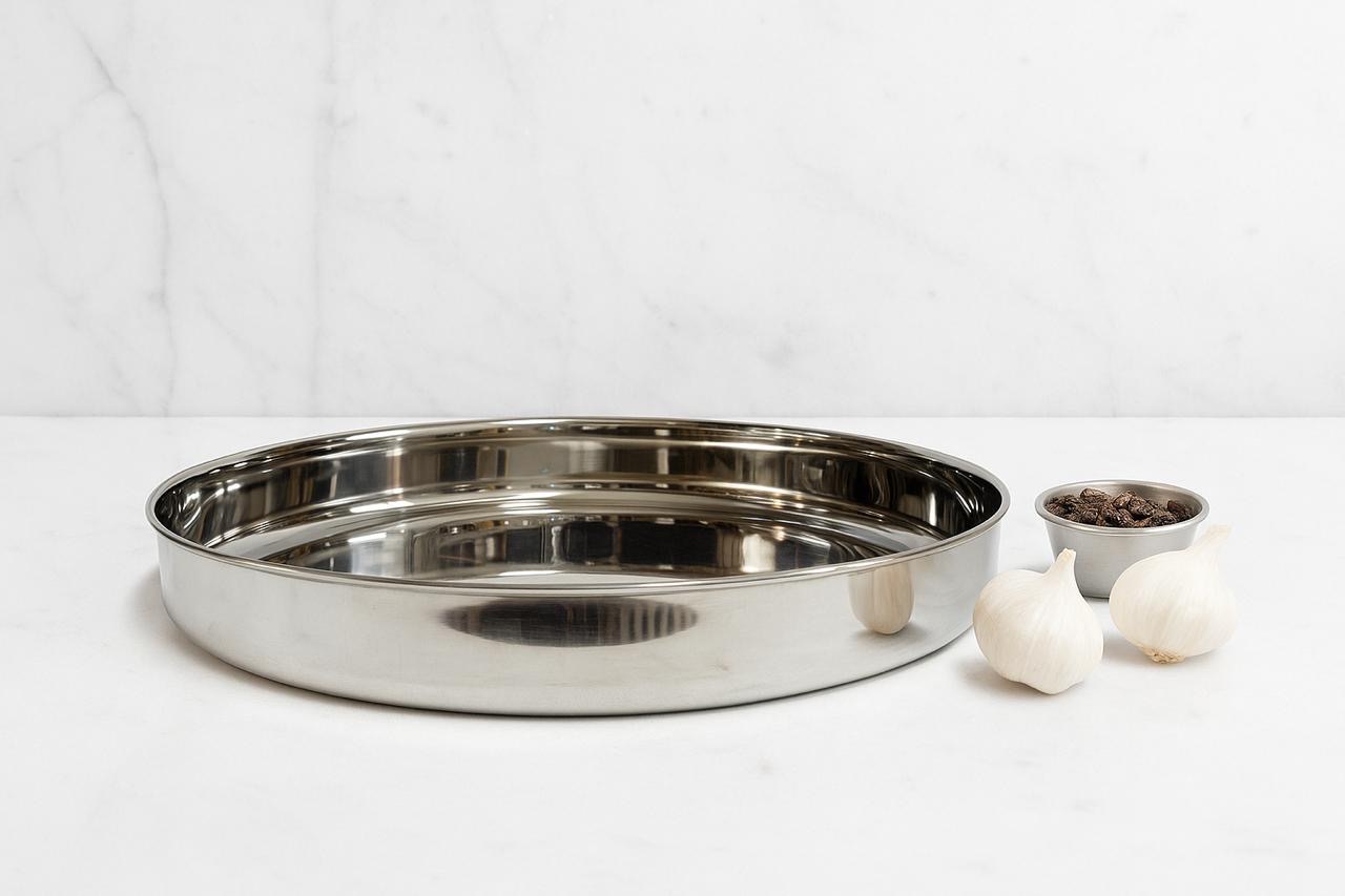 STAINLESS STEEL MIRROR FINISH RICE PLATE-KUMCHA: is a durable and elegant dining essential crafted from high-quality stainless steel. Designed with a smooth, mirror-polished finish, it adds a touch of shine and sophistication to your table setting. The plates are ideal for serving rice, curries, and traditional meals. Rust-resistant, easy to clean, and perfect for everyday use or special occasions, this plate combines functionality with style. Suitable for homes, restaurants, and canteens.